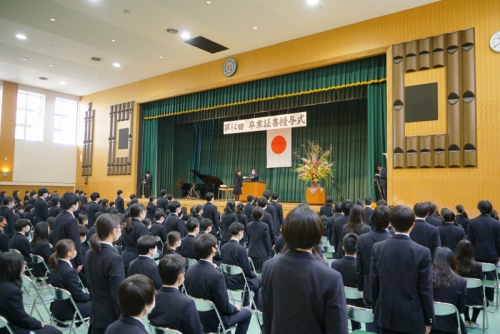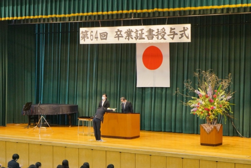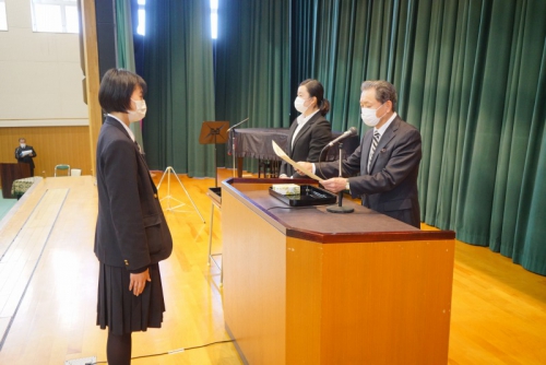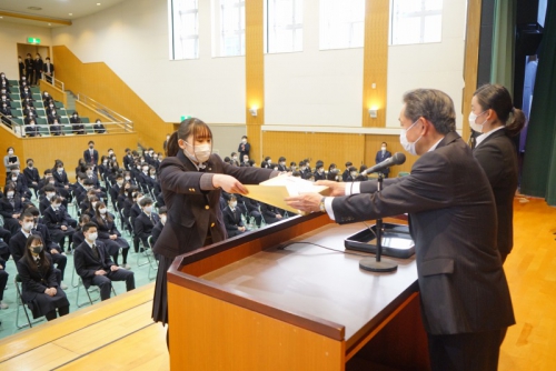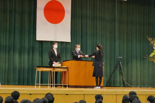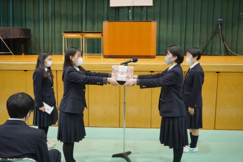卒業式が明後日に迫った2月22日(月)、3年生を対象にした年度校長表彰・各種外部団体表彰があり、その後、在校生から卒業生への記念品の贈呈が行われました。さらに、全体の式終了後には、小会議室において熊見学園奨学金授与式も行われました。