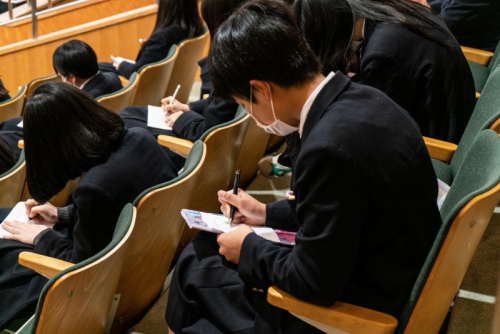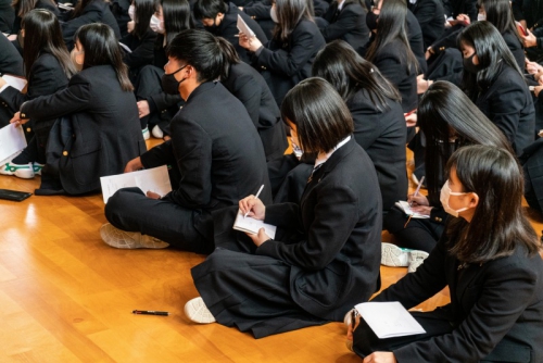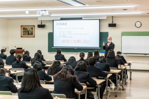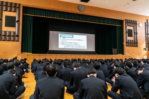 就職希望生徒には最後に、就職講座・就職ガイダンスについての説明があり、「社会人になるということは、それなりの覚悟と責任を持つということ」「過去の成績や出席状況を変えることはできないが、これから改善する努力をすることは誰にでもできる」「まずは、高校生の就職について熟知しており、外部の方が指導してくださる就職ガイダンスに参加し、第一歩を踏み出す」と、これから本格的に始まる就職活動に取り組むための心構えについて話をして締めくくりました。