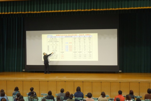 続いて2年生特進クラス担任が、2年生の現状と今後について、国公立大学の魅力や受験プランの考え方について話しました。その中で「3年の1学期でどれだけ成績を上げ、検定資格を多く取得するかが勝負」「国公立大学は生徒1人あたりの先生の数が多く、手厚い指導が受けられる」「一人暮らしをすれば、社会に出てから求められる自己管理能力が身につく」「夜間主は倍率が低い、昼に比べて夜間主は受講する生徒の人数が少なく、より先生との距離が近いというメリットがある」などといった説明を行いました。そして最後に「目指す進路に向けて、どういった勉強や検定取得が必要かを考え、しっかりプランを立てて取り組んでいけるようお子様を支えていただきたい」という話で締めくくりました。