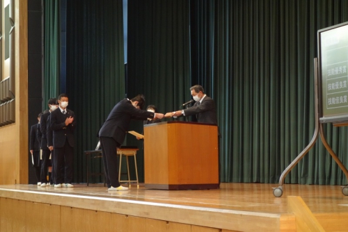 3月19日(金)、令和2年度3学期の終業式を行いました。1・2年生から各代表生徒への通知表授与・校長表彰の後、終業にあたって校長先生から話がありました。