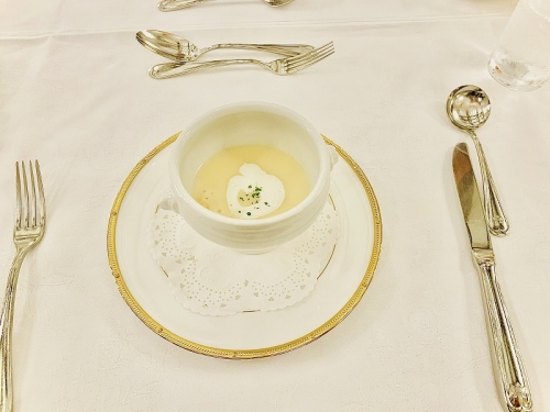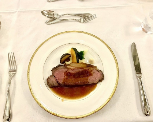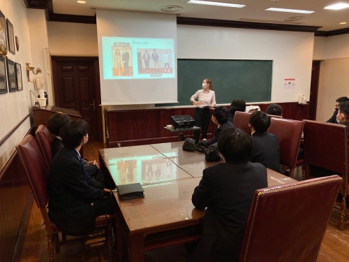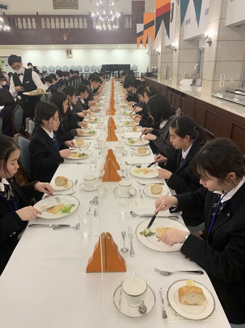 ・コース料理を食べるときに、楽しく、美味しく食事して、楽しい時間を過ごすためのマナーを学びました。カトラリーを置く位置や使う順番、持ち方を学び、料理の食べ方、食べ終わり、退席までの流れを学びました。講習後、実際にコース料理を食べました。生徒たちは学んだことを意識しながら食べているのが印象的でした。