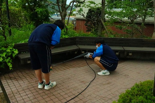 5月11日(火)の放課後、生徒会が企画・運営した清掃活動に、計203名(1年生20名、2年生31名、3年生134名、教員18名)の有志が参加し、校舎内・校内中庭(自彊園)・グラウンド周り・通学路・妙法寺駅周辺・地域の道路の清掃などをしました。外は曇り空の下での清掃でしたが、集中した中にも楽しみながら取り組み、達成感・充実感のある活動となりました。