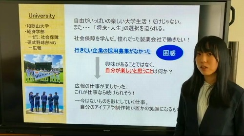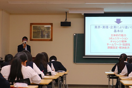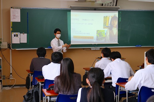 和歌山大学卒業後にペタビット(株)で活躍している社会人1名と、兵庫県立大学、和歌山大学、滋賀大学で学んでいる大学生1回生3名の卒業生たちが体験談を語ってくれた映像を視聴したり、講師の方が来ていただき説明をしていただいたり、企業で採用担当経験のある本校職員が就職に関わる大切なことを説明していただきました。
