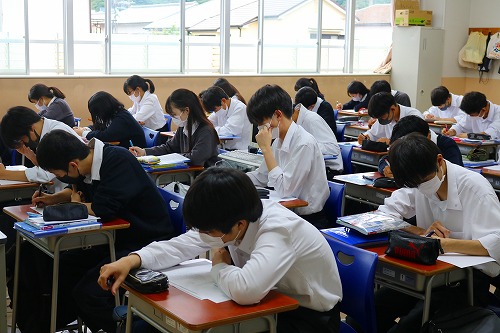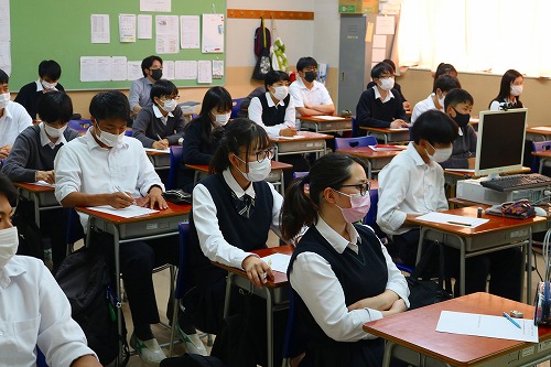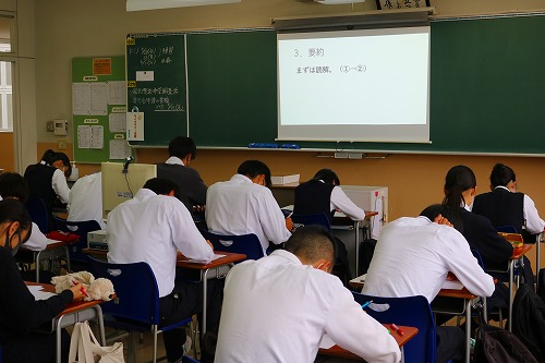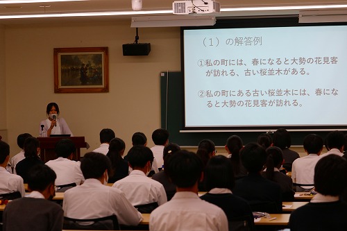 また、放課後には大学進学を目指す3年生を対象として小論文講座が開講されました。今回は大学の過去問題が教材として取り上げられました。文の読み取り方や課題文の要約についての指導、解答に必要な知識の解説などを受けながら、受講している3年生は卒業生のアドバイスもあって、いつも以上に真剣な表情で問題と向き合っていました。