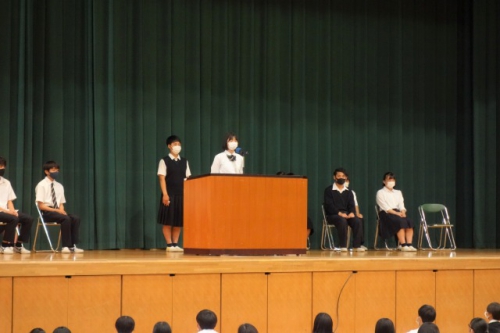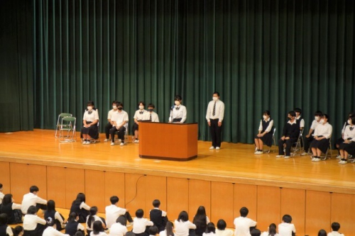 7月13日(火)、次期生徒会役員を決める生徒会役員改選を行いました。「応援弁士と立候補者の演説を聞いて、生徒会役員に相応しいと思う人をしっかり考えた上で投票してください」と、3年生の現生徒会役員による司会で始まりました。