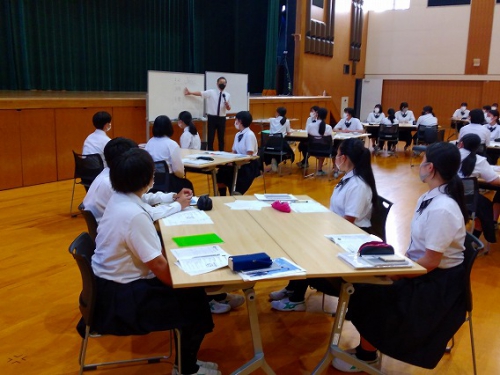 ガイダンスは今年度の就職状況についての話から始まりました。「高校新卒者には何が求められるか?」という話では、実際に高校生の採用で重視されていることの1位である「コミュニケーション能力」は話す力だけでなく、聴く力が重要であると話されました。また面接時には笑顔やマナーといった目に見える第一印象が重要であることを踏まえ、生徒たちは第一印象をよくするための立ち方・座り方、笑顔の作り方や身だしなみを教わりました。採用する側の立場から就職について考えるために、グループワーク「会社づくりゲーム」も行いました。社長・秘書役などに分かれ、採用される者に必要な強みや能力を学びました。
