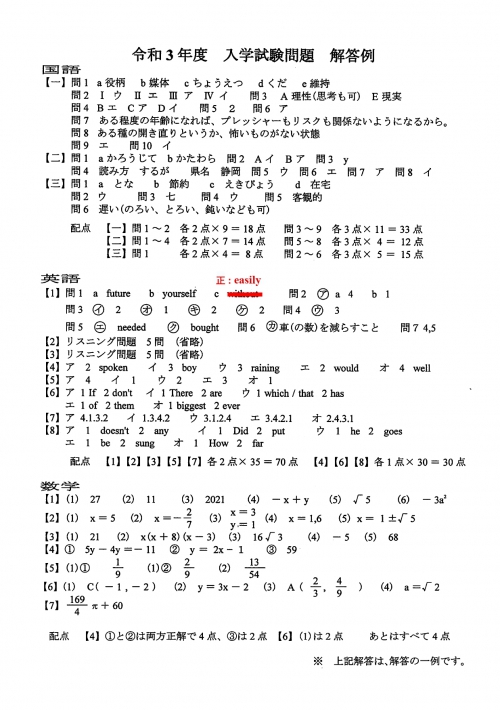 令和3年度 入学試験問題 解答例で一部誤りがありました。