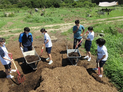 3チームに分かれて畑の畝を作る競争をしました。ウッドチップを運び、畝を作りその上に草をのせます。速さとできばえを競いました。「楽しい!」と言いながら一輪車でウッドチップを運んで盛り上がっていました。