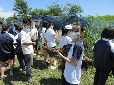 ニワトリを触らせてもらいました。みんな積極的ににわとりと触れ合っていました。