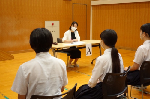また全コースの3年生就職希望生徒を対象に外部講師の方をお招きし、講堂では模擬面接会が実施されました。生徒は本番さながらの雰囲気の中で緊張感をもってグループ面接に挑戦し、入室から退室までの中で姿勢や身だしなみ、喋り方や受け答えなどについて評価を受け、そのフィードバックをもとに自分の面接を振り返りました。