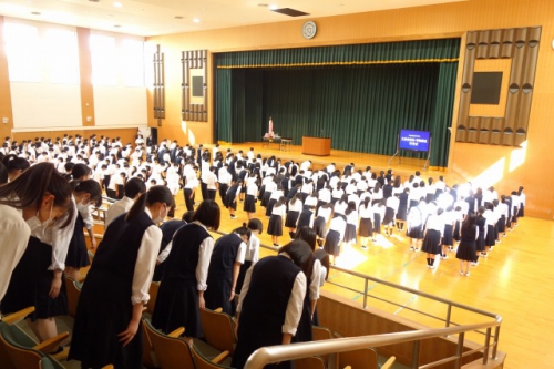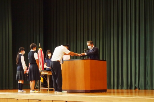 皆さん一人ひとりが様々な能力と可能性を持っています。自分の力を信じて努力し、大学入試や就職試験の合格を勝ち取ってください。今日の生徒会役員・学級委員任命式にあたり、新型コロナウイルスに感染しないよう十分に気を付け、自分の人間性を高め、夢や志の実現のために自分の人生を切り開いていってくれることを期待しています。」