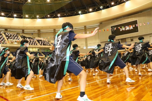 午後の部は3年キャリアコースによる10人11脚に始まり、成長リレー、ローハイドなど昨年とは違った新たな競技にも挑戦しました。クラス対抗リレーの決勝戦や綱引きでは、出場した生徒も応援する生徒も一つになって盛り上がり、会場を沸かせました。そして綱引きの後は、3年生の学年演技が行われました。学年演技は本校の名物になった「ソーラン節」です。3年生全員、背中に「瞬」の文字が刻まれたハッピを着て、息の合った「ソーラン節」を演じ切りました。