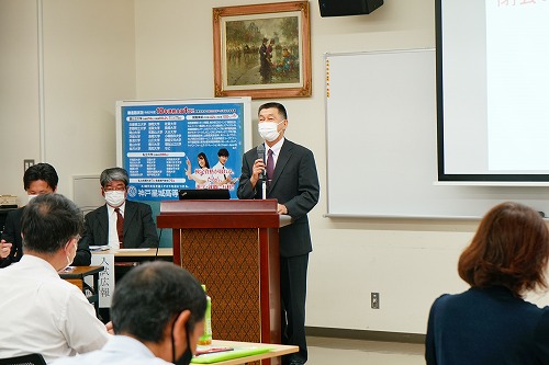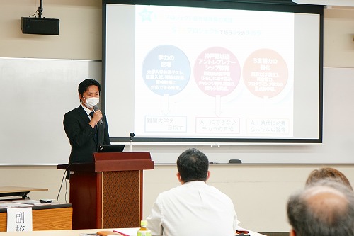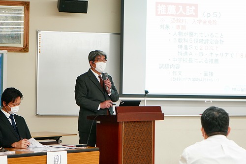 説明会は学校長のあいさつから始まり、副校長からはリアルな現状や実績を中心に、生徒数、進学実績、受験対策、英語教育、部活動について、教員の紹介や日々の様々な取り組みなども含めてお話しさせていただきました。続いて教務部長から本校の教育活動における取り組みについて、入試広報部長から令和4年度入学試験についての詳細、塾担当者のあいさつ、最後に質疑応答で説明会は終了しました。