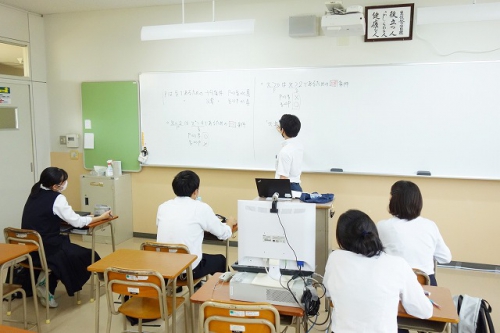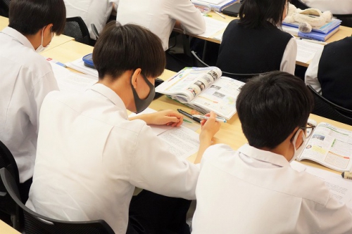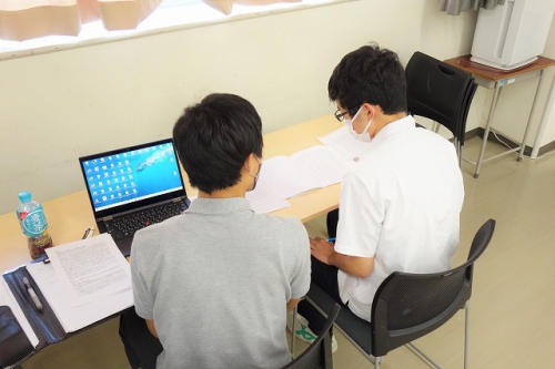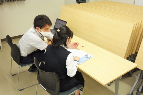 現在本校では進学を希望する3年生の生徒を対象に、普段から木曜日に実施している小論文講座に加え、毎週火・水曜日には間近に迫った共通テストに向けて対策講習を行っています。また今月14日には、共通テストを受験するべき理由や試験の内容などについて事前に知っておくための「大学入学共通テスト説明会」を実施しました。ライブラリーで自学自習に取り組んだり、繰り返し小論文の添削を受けたりなど、放課後の時間を活用しながら受験勉強に励む生徒の姿も見られます。