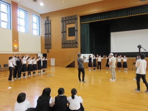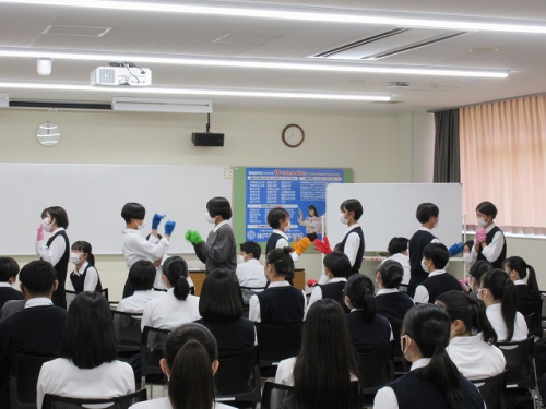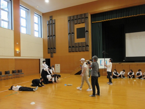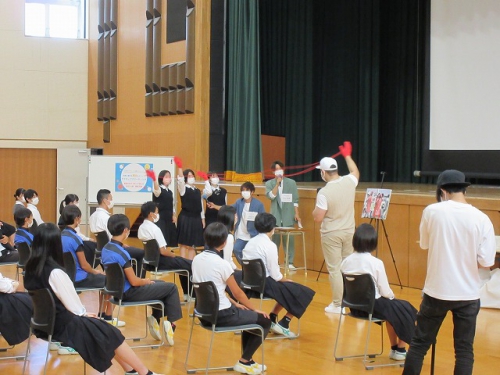 午前中は大会議室において座学研修を中心に行いました。グリーターという職業の紹介から始まり、手鏡で確認しながらの表情づくり、カラフルな手袋を用いたオリジナルハンドシェイクづくりなどを通しグリーティングの重要性を学びました。午後は講堂に場所を移し、パントマイム、ジェスチャーゲームを取り入れる中で、ノンバーバルコミュニケーションの大切さについて学びました。その後は8グループに分かれ、今年行われるドバイ万博や2025年大阪万博での各国のパビリオンをイメージし、ノンバーバルコミュニケーションで各国を紹介するゲームを行い、最後は「Welcome to JAPAN」の記念撮影で締めくくりました。