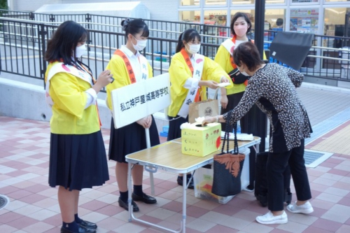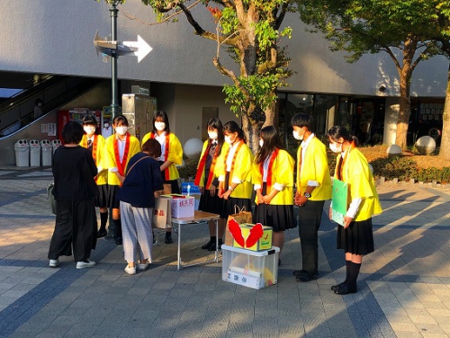 短い時間でしたが、生徒たちが募金箱を手に「ご協力お願いします!」と呼び掛ける声で駅前を通行中のたくさんの方々が足を止め、募金をしてくださいました。同時に、生徒はみなさんの優しさや心の温かさを感じ、充実感を得るとともに有意義な時間を過ごせたようです。募金に協力くださった地域の皆様、ありがとうございました。