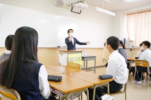 10月13日(水)の6校時、1年生特進Sコースの生徒を対象に、一般社団法人関西ニュービジネス協議会の副会長で、八戸ノ里ドライビングスクールの代表取締役でもある谷岡樹氏に講師としてお越し頂き、全6回のうち第4回目となる「16歳からの起業塾」というテーマの授業が行われました。