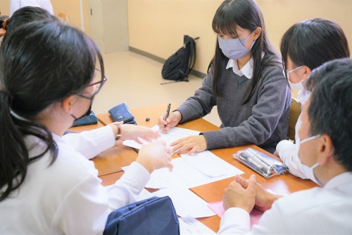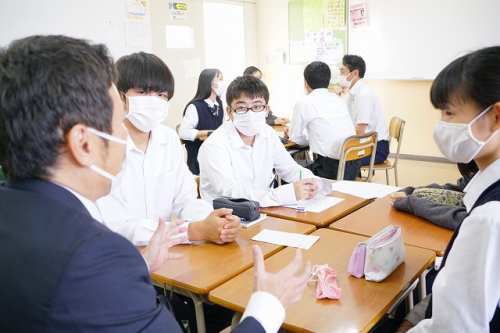 今回の授業では、夏休みの宿題として「ビジネスの種」を考えるという課題が出されており、それを基に5つのグループに分かれてビジネスプランを考えました。「調味料の容器とフタの分別が大変」「押しボタン式信号であることに気づかず、長い間待たされた」など、日ごろ感じた不満を「ビジネスの種」としてアイデアにし、その不満を解消する方法からいかにビジネスにつなげるか、実際にビジネスをされている経営者の方の視点から指導を受けながら、生徒も積極的に意見を出し合って考えました。どのグループも議論は尽きず、「アイデアを形にする難しさ」を実感するとともに、そういった経験を実際にされてきた講師の方から多くのヒントを得て、とても実りある時間を過ごすことができました。