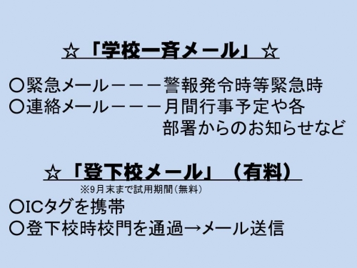 先日記入して頂いた、「学校一斉メール」および「登下校メール」の準備が整いました。