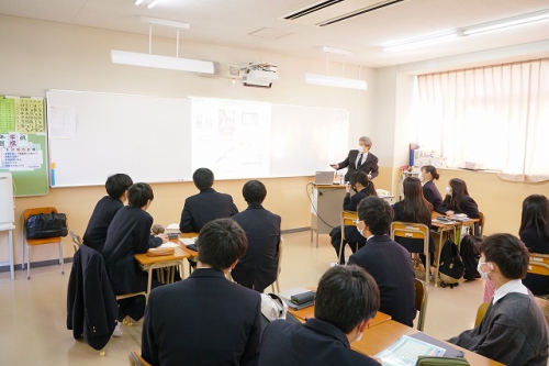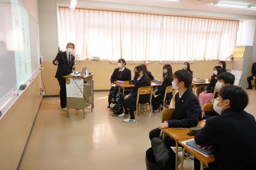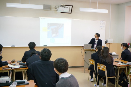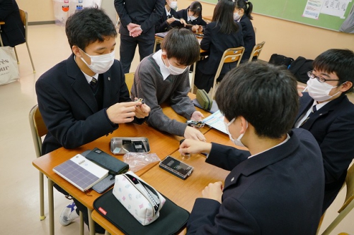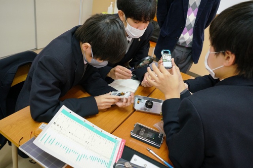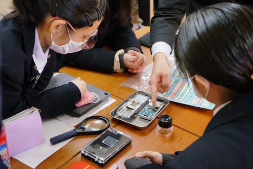 11月13日(土)、特進Sコースの1年生を対象に、三菱電機株式会社の方にお越しいただきITエレクトロニクス講座を行いました。普段身近にある電気製品を構成する機械部品、電気部品、電子部品の説明や、中核部品となるLSI(大規模集積回路)について、実際に携帯電話を分解して仕組みを観察しながら、それぞれどういう働きをしているか詳しく解説をしていただきました。さらに電子機器には欠かせない半導体について、材料となるシリコンを使ってどうやって作られるか、そしてその半導体を使ったLSIが2進数で情報を処理する方法など、かなり技術的な内容も知ることができました。