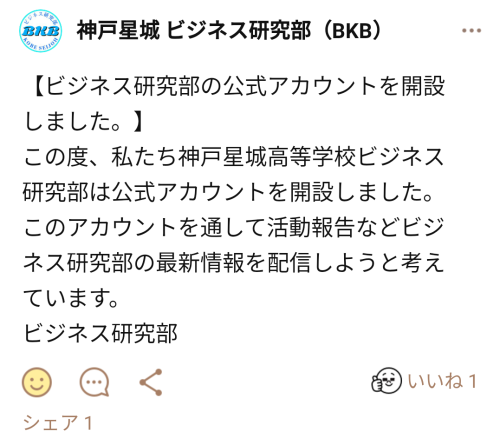 「私たち、神戸星城高等学校 ビジネス研究部は検定取得の為の勉強をしたり、ビジネスアイデアコンテストや、イノチャレ!神戸2021に参加したりしています。この度、LINE公式アカウントを開設し、ビジネス研究部の活動報告など配信していけたらと考えています。」