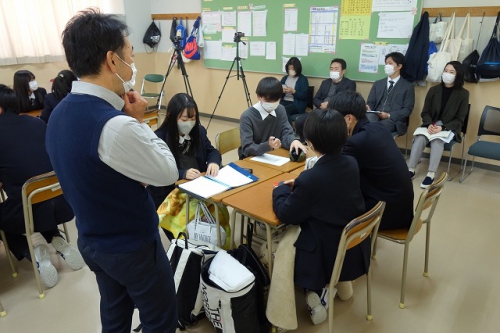 情緒的な価値(用事)について、講師から「ほかの店舗において1,500円で売られているサッカーボールを3,000円で売るにはどうするか」という問いが出され、グループに分かれて考えました。生徒からは「おまけを付ける」「有名な選手にサインを書いてもらう」「ボールに対して保証を付ける」などのアイデアが出ました。生徒から出た意見を踏まえて、「リフティングが10回できるまで何度も教えてくれるサービスをつけて成功した実例がある」、「お金の価値は消費者によって変動する。消費者が欲している価値を考えることでアイデアが広がる」とお話がありました。