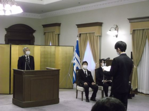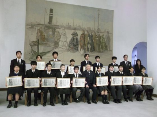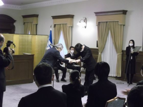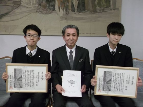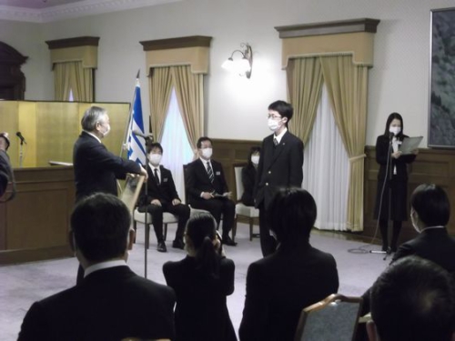 令和3年度 文化・スポーツで活躍した兵庫県内の私立学校の生徒に贈られる「マロニエ賞」の表彰式が令和3年12月22日(水)兵庫県公館において行われました。マロニエの花言葉は「天分・天才」とされており、各分野において最高位の賞を受賞した中高生や教諭に贈られるに相応しい名称となっています。2021年度は、9団体と27人が受賞しました。