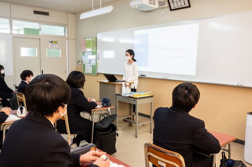 広島大学・神戸市外国語大学に通っている2名の卒業生が本校まで足を運んでくれ、一橋大学大学院の卒業生1名もリモートで加わり、計3名が進路に向けて取り組むべきことや合格するための勉強方法など、自らの経験談を交えながら語ってくれました。それぞれプレゼンテーションの後、卒業生ごとにブースを作り、生徒は3グループに分かれて直接質問などをしながら話を聞きました。
