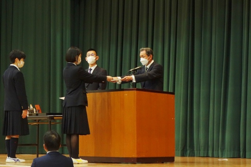 3月18日(金)、令和3年度3学期の修業式を行いました。1・2年生から各代表生徒への通知表授与・校長表彰の後、修業にあたって校長先生から話がありました。