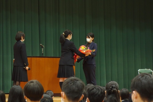 続いて離任式が行われ、今年度で退職される先生方が紹介されました。修業式の後に行った表彰伝達式・壮行会については別の記事に分けておりますので、そちらをご覧ください。