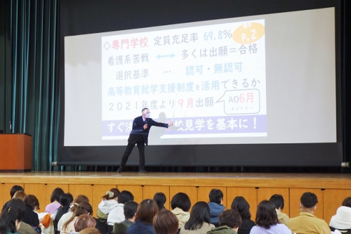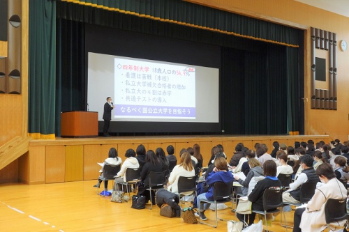 進学については、「本年度の進学状況・入試の特徴」、「入試方法の種類と傾向」、「学費について」、「学習指導について」と幅広く説明を行いました。また今後の取り組み方について、「大学選択、志望理由の作成などの活動が面接でもプラスになり、大学への学びにつながる」「合格を目指すと同時に、その過程で力をつけられるようにしっかりサポートいていきたい」とまとめました。