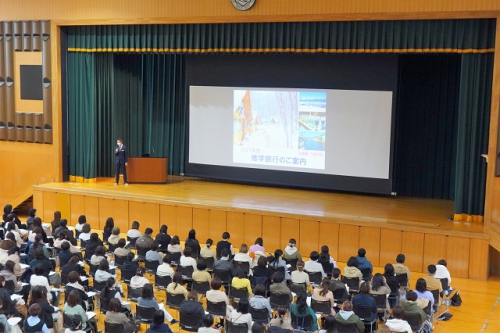最初は日本旅行の方による修学旅行についての内容で、北海道の観光地やホテルなどの写真を交えながら行程説明をしていただきました。「皆さんにとって良い思い出になるよう取り組んで参ります」と締めくくられました。