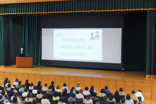 就職については、「令和2年度に新型コロナウイルスの影響で求人の数が減り、心配もあったが、以前の状態に少しずつ戻りつつある」「学力も当然必要だが、就職においては特に人間力が必要になるので、就職に向けた活動を通して積極性やコミュニケーション能力を伸ばしてほしい」といった話から始まり、就職状況、求人の流れ、指定校求人と公開求人の違いや校内選考会などについてご説明しました。最後に「お子様には、積極的に進路指導室に足を運び、情報を収集するように努力してほしい。また最後まであきらめない・絶対に他人の責任にしない・独りよがりにならないという3つの覚悟を持ってほしい」と、今後の展望を伝えました。