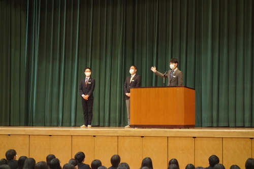 続いて旅行でお世話になる旅行社の添乗員の方、写真館の方などからもあいさつがあり、最後に代表生徒が登壇し、修学旅行に行くにあたっての決意を述べました。