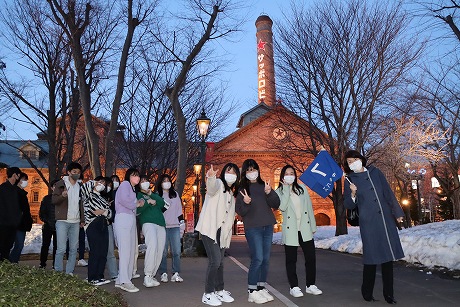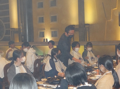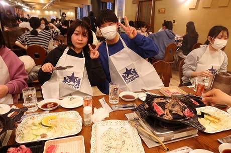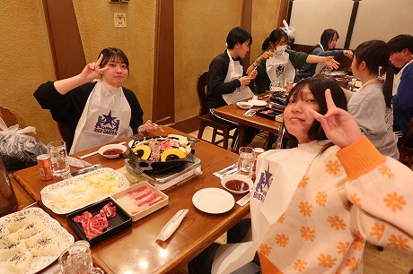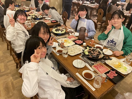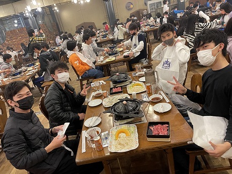 その後、荷物をまとめて、バスで今日の宿泊地 札幌プリンスホテルに移動しました。移動の途中に立ち寄ったサッポロビール園で夕食の焼肉(ジンギスカン)食べ放題を堪能しました。男子生徒だけでなく、女子生徒も追加でお肉の注文する様子が見られました。