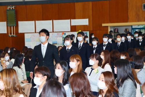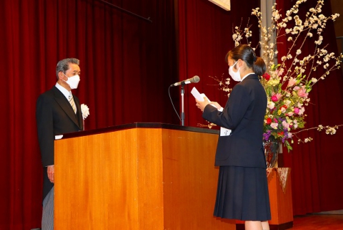 育友会会長によるご祝辞では、「3年間は長いようで、月日が過ぎ去るのは早いものです。3年後にみなさんが自信を持って、笑顔で未来へとはばたいていけるように、悔いのない高校生活を過ごすことを願っています」と激励の言葉をいただきました。