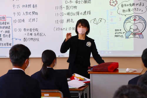 今後の予定ですが、明日4月8日(金)に全校生が集まる始業式、土日を挟んで11日(月)は課題・実力考査、12日(火)は校内オリエンテーション、13日(水)は健康診断、14日(木)は避難訓練・学級委員任命式があります。来週から本格的に高校生活が始まりますので、入学のしおり・生徒手帳「良志久」・本日の資料等の内容を頭に入れ、良いスタートがきれるようにしましょう。