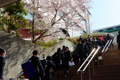 通学路の満開の桜の下を、真新しい制服に身をつつんだ新入生が登校してきました。教職員が拍手で迎える中、担任の先生の引率で新入生367名が体育館に入場し、入学式が始まりました。