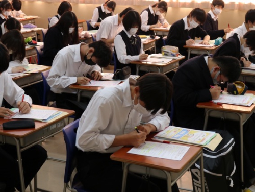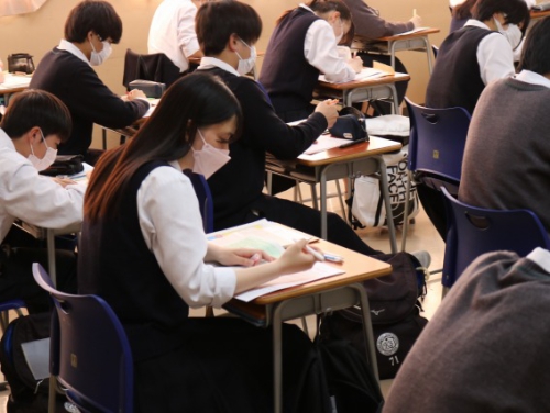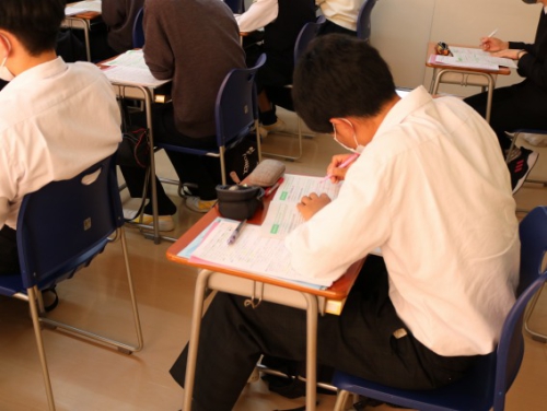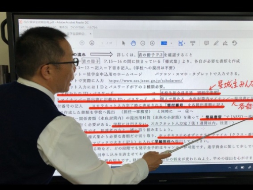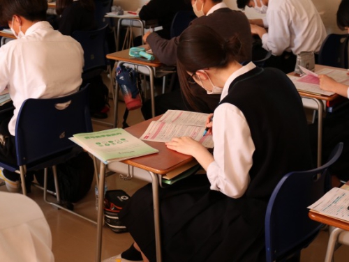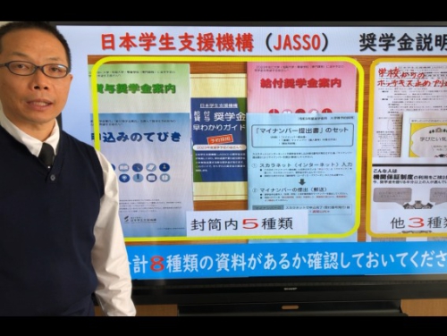 4月28日(木)、進学に向けて取り組む3年生に向け、日本学生支援機構奨学金説明会を実施しました。スライド・動画を使いながら奨学金制度の説明、申し込みの流れや締め切りなどの注意点について詳しい解説がありました。生徒たちは貸与型と給付型の違いなど、制度に関する具体的な内容を聞きながら一生懸命メモを取っていました。
