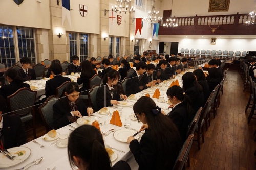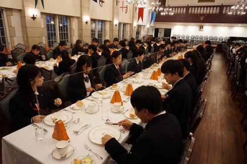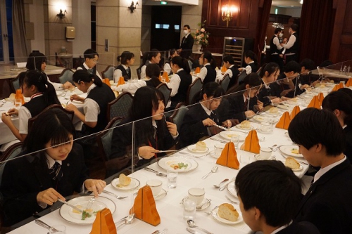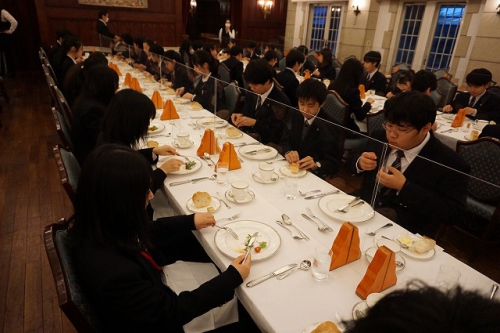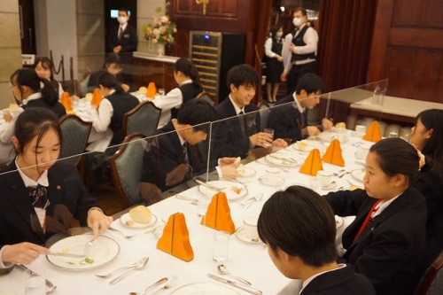 テーブルマナー講習では、教わった作法を守り、少し緊張しながらディナーコースをおいしくいただきました。20:30~22:00は入浴と自由時間ですが、それぞれにリフレッシュします。入浴前に、広大な敷地でジョギングを楽しむ生徒もいました。