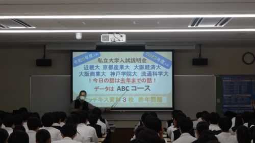 今回は近畿・京都産業・神戸学院・大阪経済・大阪商業・流通科学大学の6大学を中心に、入試日程や出願方法、昨年の実施状況について詳しく解説し、生徒はメモを取りながら真剣に耳を傾けていました。