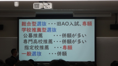 まず最初に総合型選抜や学校推薦型選抜の入試の仕組みについて触れながら、昨年の卒業生がどのような受験方法を活用し、進学したか等についても説明がありました。