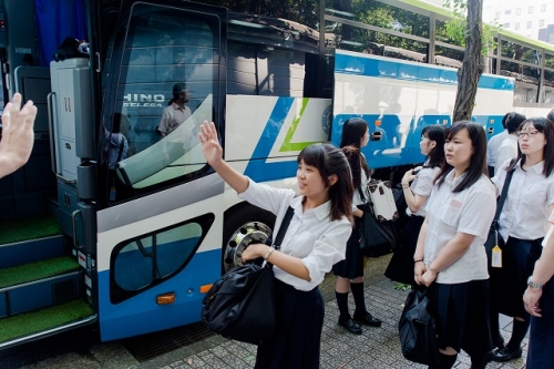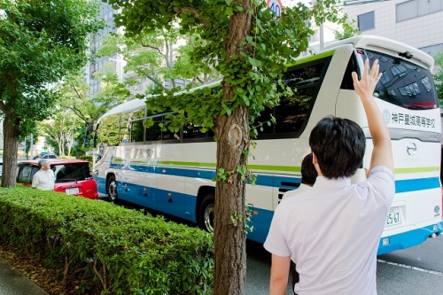 7月20日(木)8時30分、湊川神社前に集合した海外教育研修団(26名)は、いよいよアメリカへ向けて出発しました。生徒たちはお見送りに来て頂いた保護者の方々や先生方に「行ってきます!」と笑顔で手を振り、別れの不安よりまだ見ぬアメリカへの期待感が強いようでした。バスは関西国際空港へ向かい、チェックイン後、海を越えてアメリカのサンフランシスコに到着します。生徒たちの活動の様子はホームページで随時紹介しますので楽しみにしておいてください。